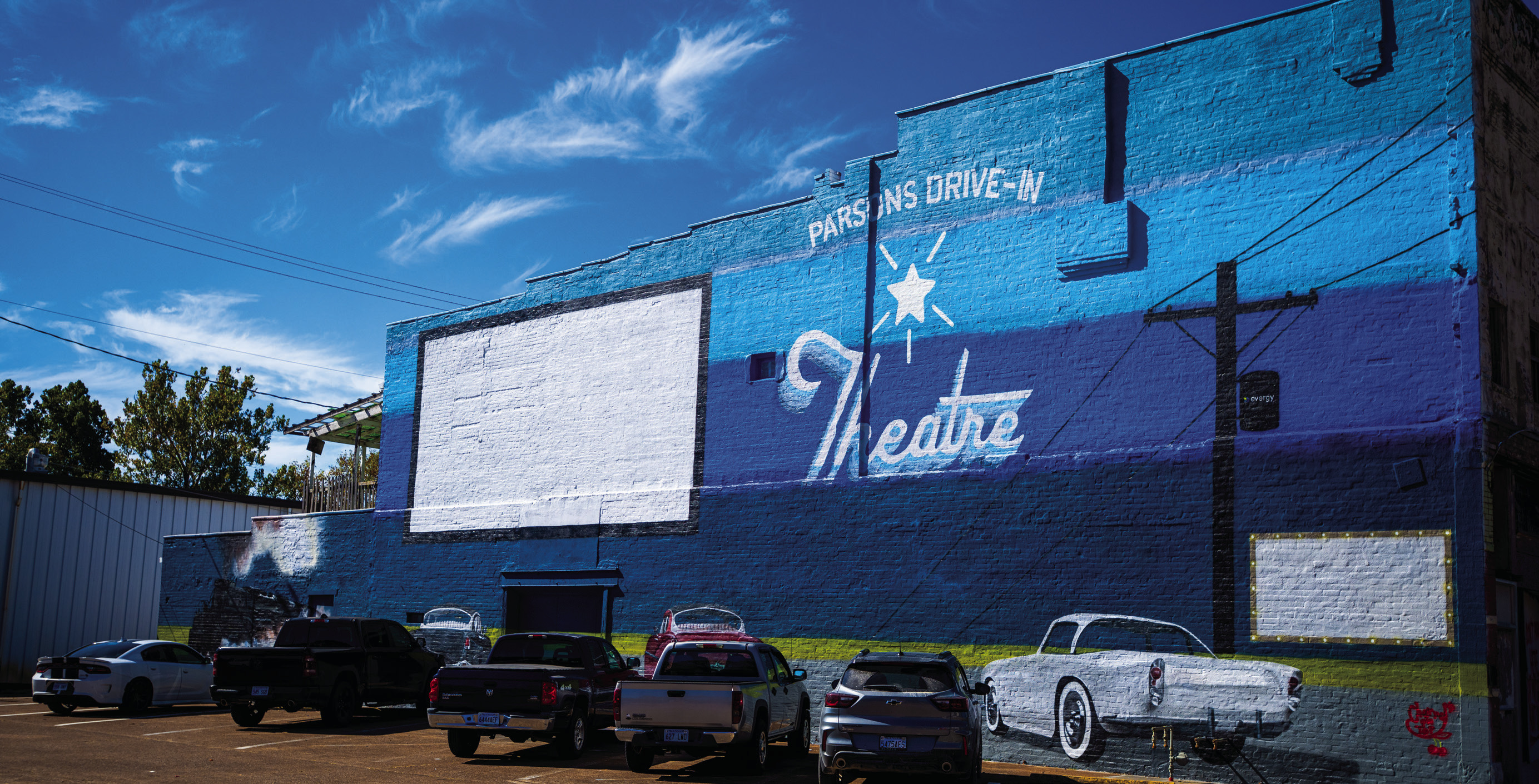 The mural features a large white square where movies can be projected. It also details vintage cars, a railroad, and a telecommunications pole featuring an Evergy logo, who contributed funds to the project. A blank marquee on the mural can be painted and repainted to advertise the next upcoming film.