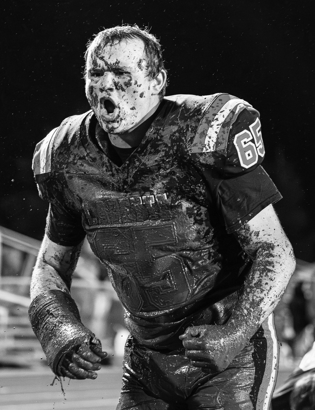 Justin Nash of the Labette County Grizzlies howls after sliding in the mud in celebration of Friday’s 35-14 win over the Chanute Blue Comets, securing the Grizzlies a share of the SEK League title, on Friday night at Labette County High School in Altamont. Sean Frye/Sun photo