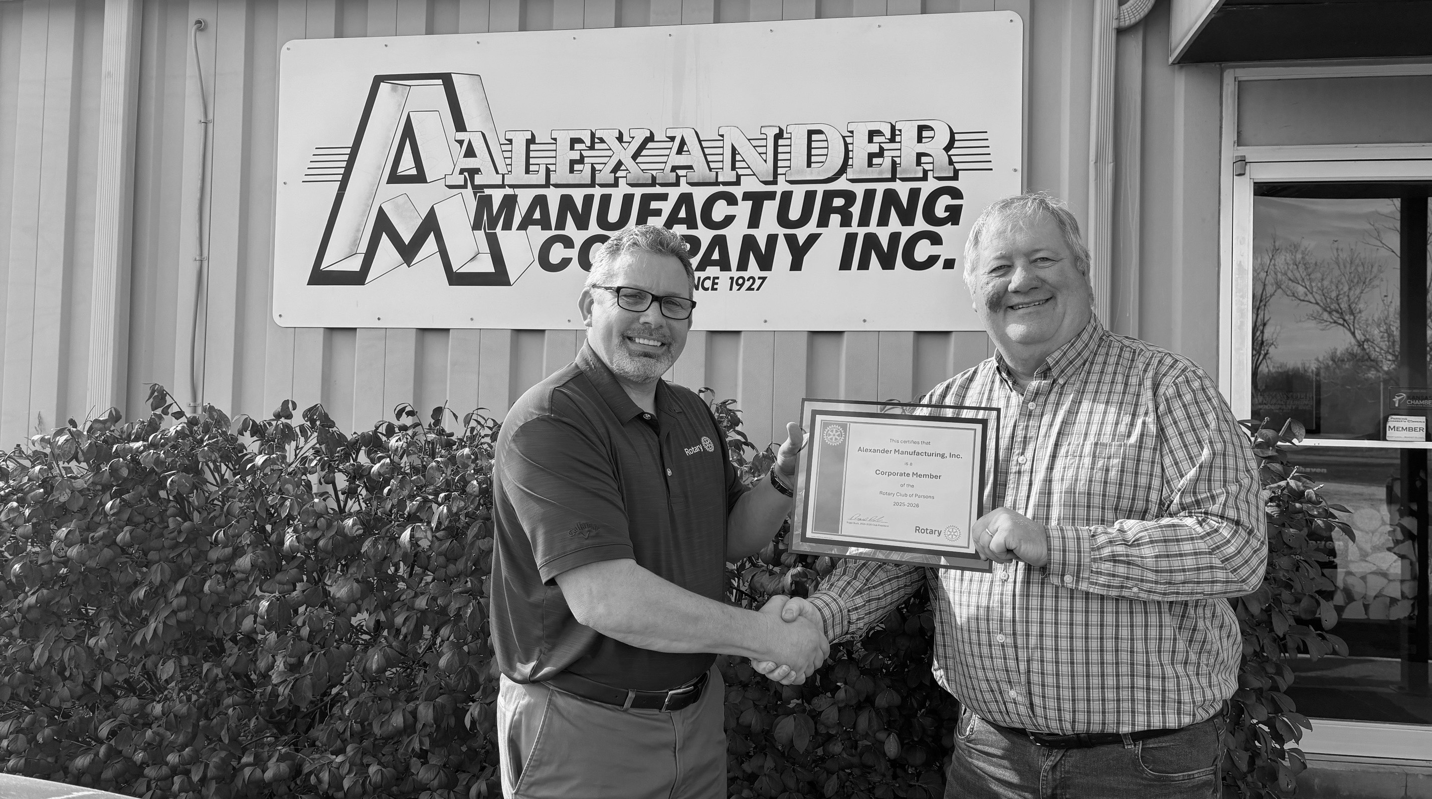 Tim Price, left, Parsons Rotary Club Membership Chair presents a Corporate Membership Certificate to Don Alexander, right, president of Alexander Manufacturing. Courtesy Photo