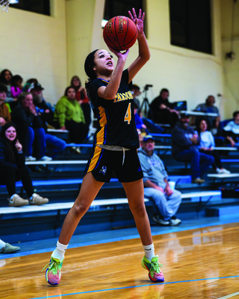 Desi Webb (4) of the Parsons Vikings lifts up a 3-point shot during Thursday’s win over the Columbus Titans at the Lancer Classic at Southeast High School in Cherokee. Sean Frye/Sun photo