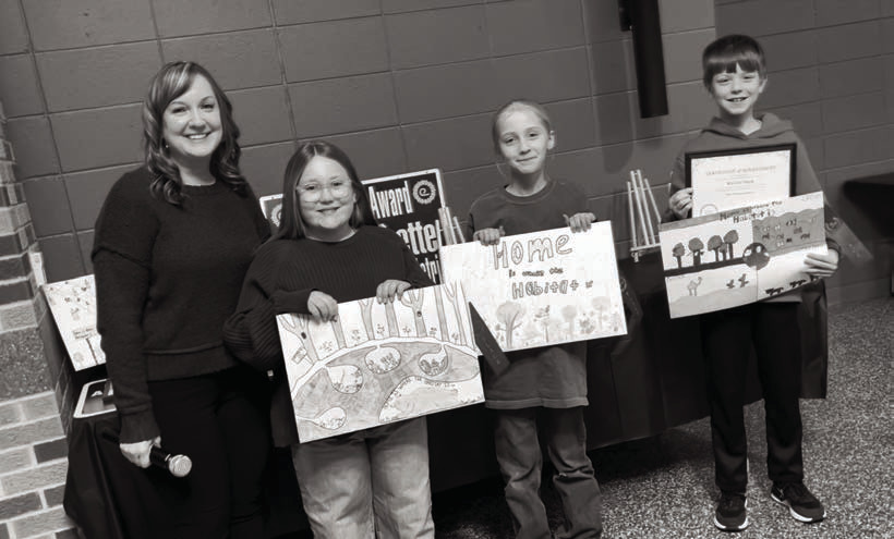 Above: First place winners in the fourth and fifth grade poster contest were acknowledged during the annual conservation meeting. Pictured winners include: Macey Lay, Hailey Choi, and Hallie Snider. They are pictured with Disrict Manager Elissa Robison, left. Below: Third place winners in the fourth and fifth grade poster contest were acknowledged during the annual conservation meeting. Pictured winners include: Corda Lahey, Brynlee Robison, and Khyrie Jones. They are pictured with Disrict Manager Elissa Robison, left.