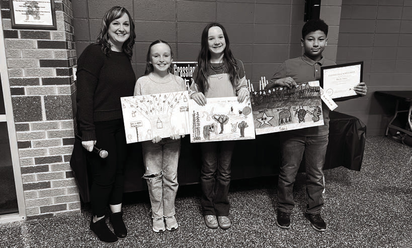 Above: The Labette County High School chapter of the Future Farmers of America attended the annual Labette County Conservation District meeting. Below: Second place winners in the fourth and fifth grade poster contest were acknowledged during the annual conservation meeting. Pictured winners include: Emma Booth, Adaline Phillips, and Kaison Nash. They are pictured with Disrict Manager Elissa Robison, left.