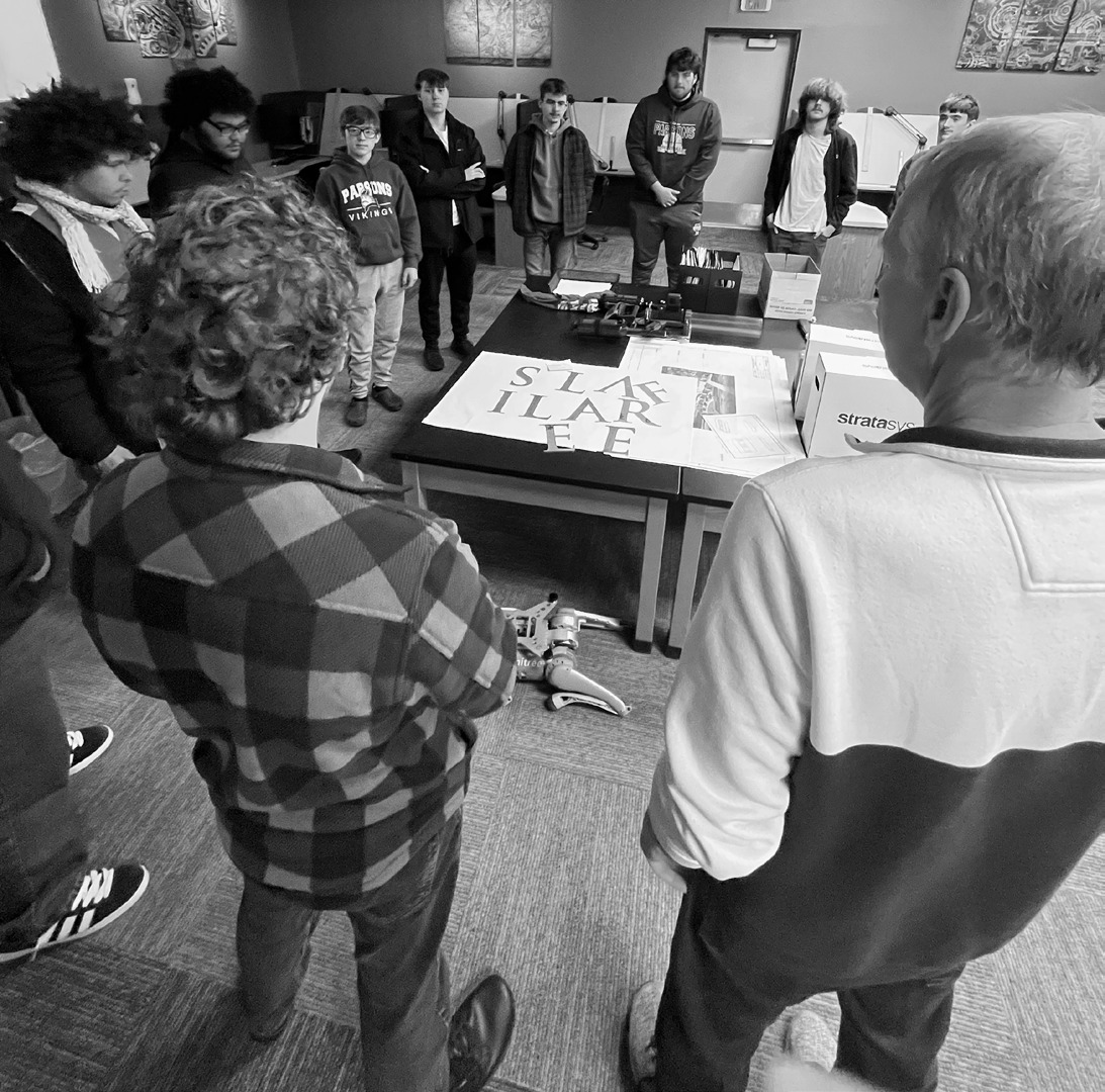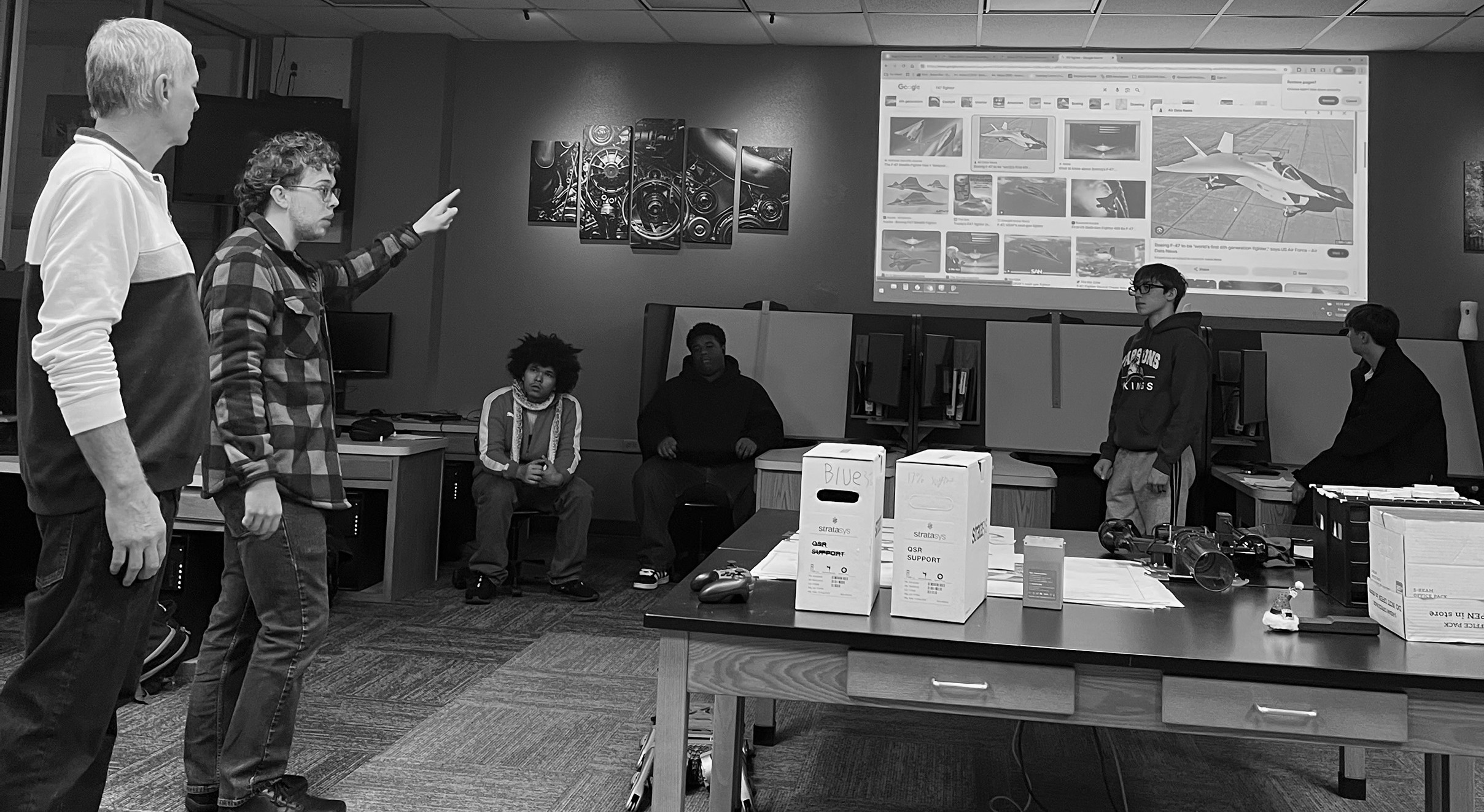 Ducommun engineers Jeff Wolverton and Wesley May delivered titanium letters to PHS students Friday that they cut from scraps of material used to build fighter jets. They two instructed students on the process they will follow to attach the letters to an arched beam on the veterans memorial the students are helping to build. They also visited with students about projects Ducommun is currently working on, like the stealth F-47 fighter jets. Courtesy photo USD 503