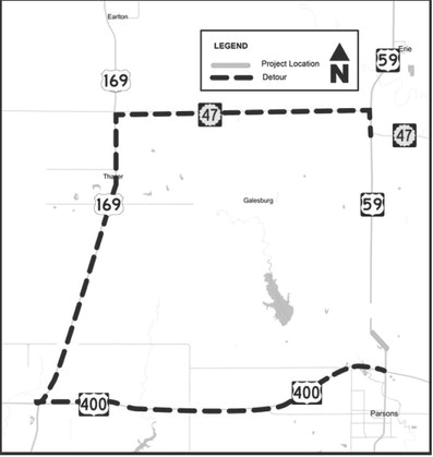 The official detour will take northbound U.S. 59 traffic west on U.S. 400, north on U.S. 169 and east on K-47 to reconnect with U.S. 59. The inverse route will take southbound U.S. 59 traffic around the work zone.