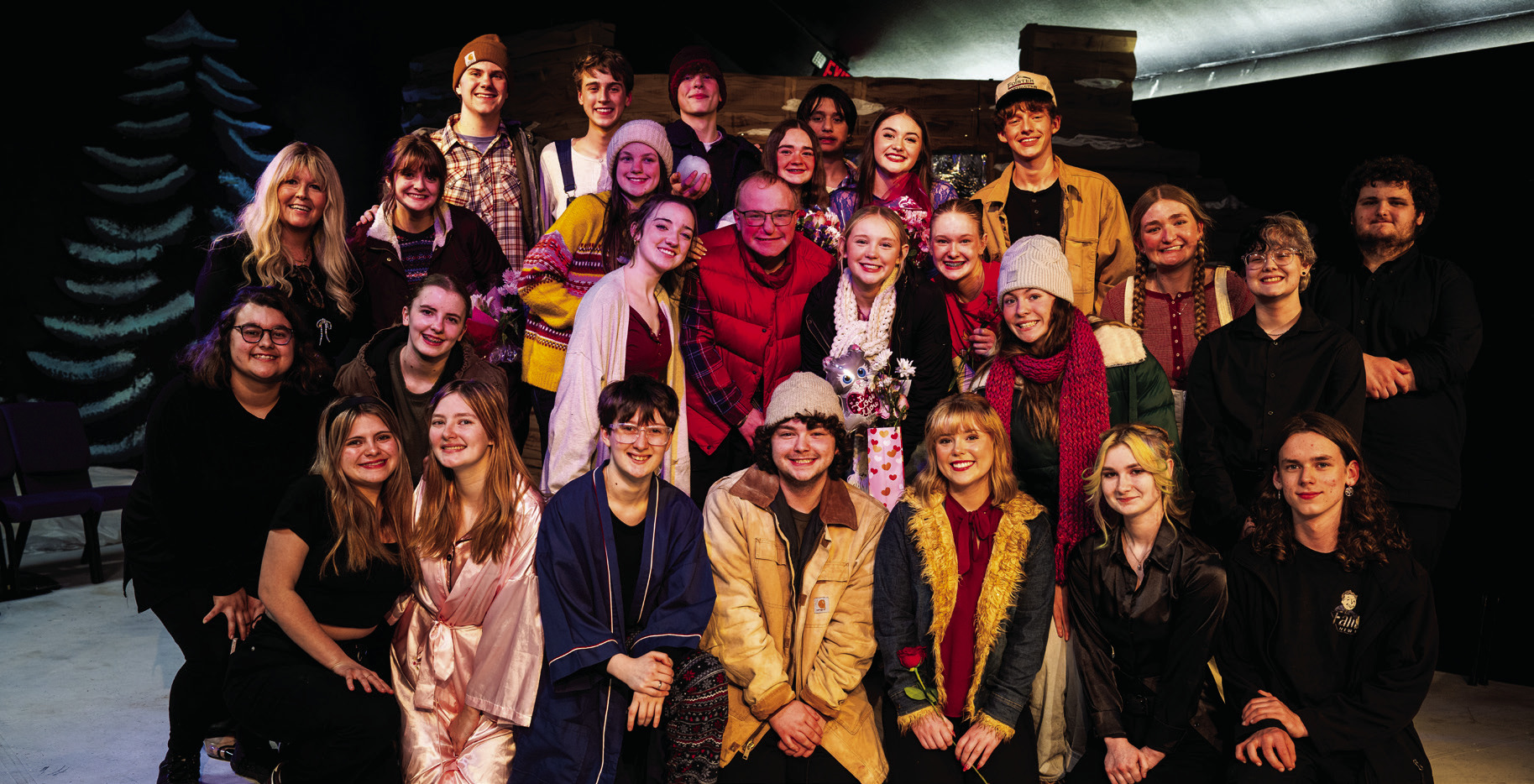 Sean Frye/Sun Photos TOP: Frank O’Banion (left) and Kinsley Lassen (right) cozy up to each other during the prologue of “Almost, Maine,” the latest production from the Labette County High School theatre department on Saturday night. BOTTOM: The entire cast and crew of “Almost, Maine” following its closing night performance on Saturday night at Labette County High School.